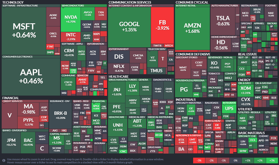 전날 미국 증시지도를 볼 수 있는 사이트, 이 외에도 선물, 외환, 암호화폐 등 다양한 정보들을 그래프와 색상으로 표현해주는 사이트다.